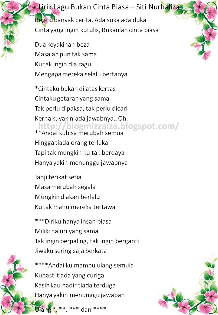 Dan kamu yang temaniku seumur hidupku. Lebih banyak lagu akan menyusuljangan lupa . Simak lirik lagu bukan cinta biasa atau populer dengan lirik cintaku bukan di atas kertas oleh siti nurhaliza, kini viral di tiktok. Bukan cinta biasa dipopulerkan siti nurhaliza pada 2003. Simak lirik lagu 'bukan cinta biasa' dari album the one yang dirilis tahun 2010 dan dinyanyikan oleh afgan. Begini lirik lagu bukan cinta biasa dari siti nurhaliza.